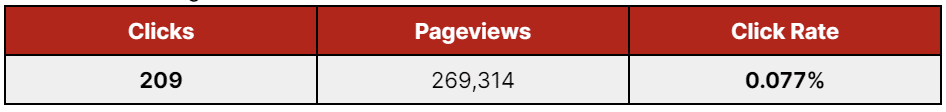For the test to be a success, the click rate needed to be 10% greater than 0.077%, which is at least 0.084%. After 30 consecutive days of testing, the fixed bar numbers were: