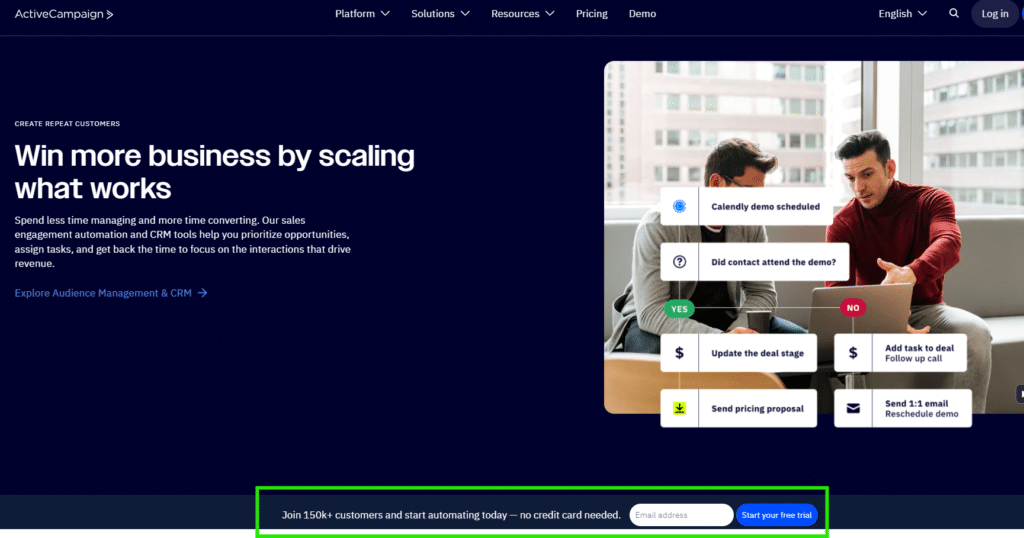The email marketing and CRM automation platform already places a form field and a CTA for the free trial period in the fixed footer (highlighted in green in the image below).