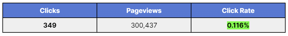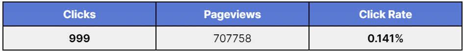 The click rate would be determined through the relationship between visits to pages where the fixed bar was located and the number of clicks on the CTA in a monitored period of time. We calculated it as follows: the number of clicks on the CTA divided by the total number of page views. The result is then multiplied by 100.