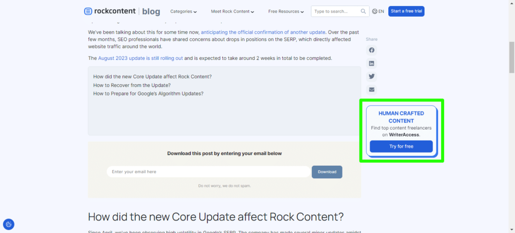 In the following image, you can see the CTA with the message “Human Crafted Content: Find top content freelancers on WriterAccess. Try for free” on the right side of the blog.