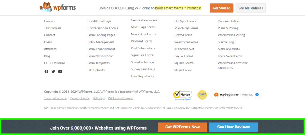 WPForms is a plugin that facilitates the construction and implementation of forms within websites made with WordPress. In the fixed bar, they placed two CTAs: one to purchase the plugin and another directing users to reviews.