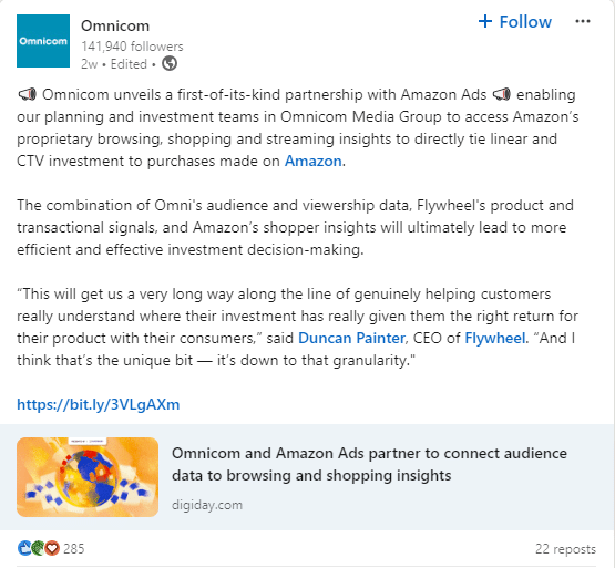 One significant partnership that stood out was between Omnicom and Amazon Ads. This duo is combining their strengths to integrate Amazon’s ad tech into Omnicom’s platform, increasing data connectivity and insights for better targeting and personalization.