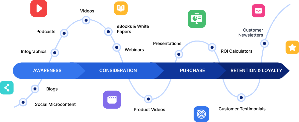 Cada parte del contenido ayuda a los lectores a moverse sin problemas a lo largo de la jornada completa, desde la percepción de la marca, hasta la consideración y luego la decisión; así como también desde las primeras visitas hasta convertirse en leads informados y finalmente en clientes. La riqueza y la presencia de los recursos adecuados en cada etapa de la jornada mantendrán a los leads avanzando hacia la compra.