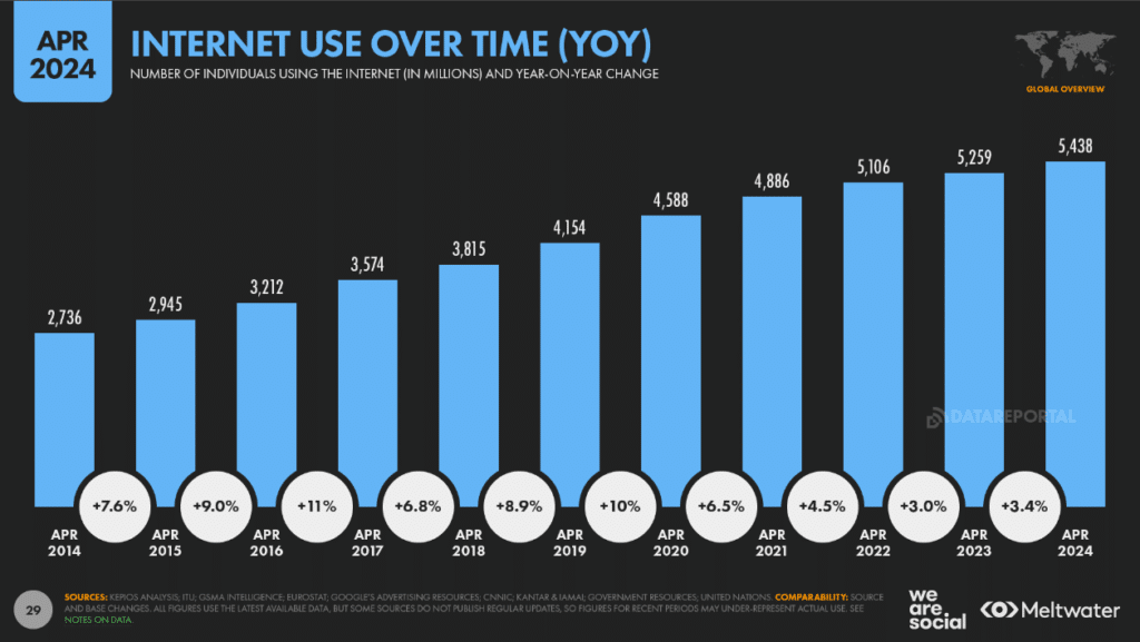 By now, it might seem impossible that the number of global internet users is still steadily climbing, but that’s exactly what’s happening. According to recent research, there were approximately 5.4 billion web users worldwide in 2024.