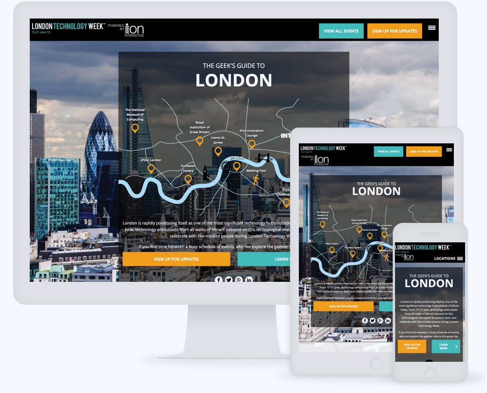 Bilton and his team decided to use interactive content to create excitement around London Technology Week, so the team from Ion worked with the company to leverage existing content for a fun, interactive experience that would get London techies excited for the big event. They found the perfect piece of static content in the form of an article called “A Geek’s Guide to London,” which was an in-depth look at not just the week’s events, but also the city’s unique relationship to technology. The Ion team thought the content would make a perfect interactive map that could also serve as a mobile guide to London Technology Week in real time.